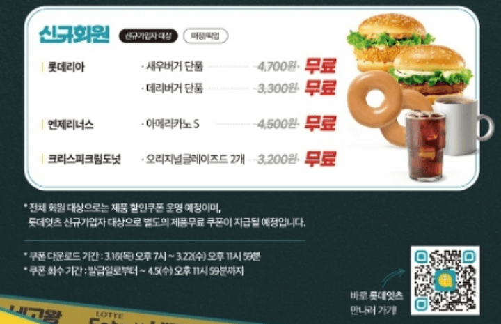 신규회원의 경우 롯데리아 새우버거 단품, 데리버거 단품, 엔제리너스 아메리카노 S, 크리스피크림도넛 오리지널글레이지드 2개를 무료로 받을 수 있는 쿠폰이 지급됩니다.