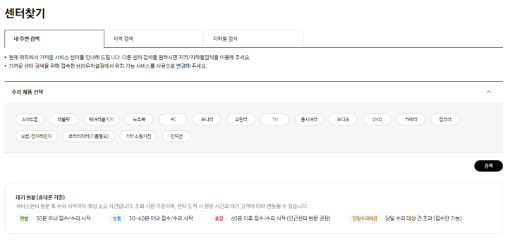 출장 예약이 가능한 제품은 세탁기, 건조기, 에어 드레서, 에어컨, 프린터, 청소기, 건강가전, 주방가전, 오븐, 정수기, 오디오이고 나머지 제품은 직접 들고 가서 수리를 받아야 됩니다.