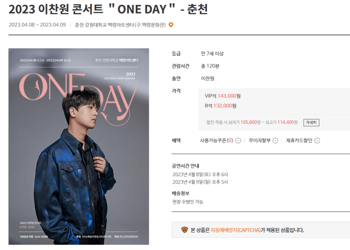 이찬원 춘천 콘서트 티켓은 VIP석 143,000원, R석 132,000원이며 공연시간은 총 120분입니다.