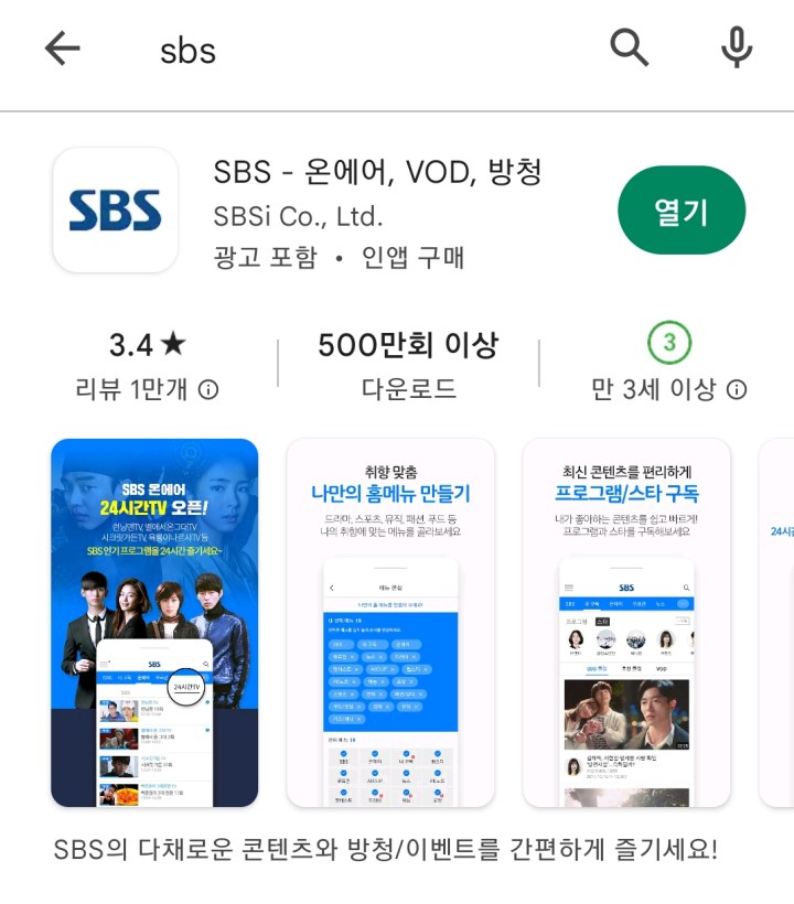 SBS 어플을 예로 설명드리면, 구글 플레이스토어에서 'SBS'를 검색해서 다운로드해 주세요.